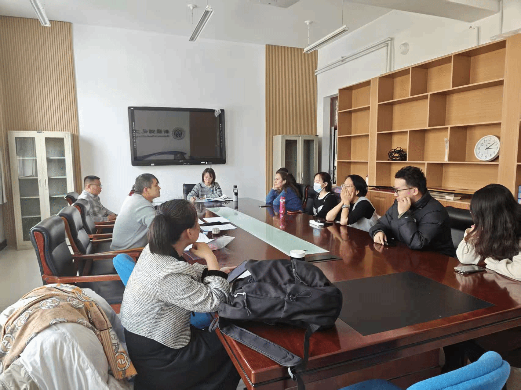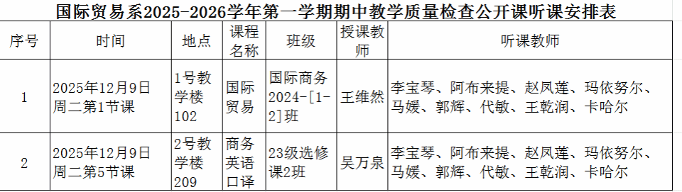 本次活动聚焦课堂教学实效,分两场公开课有序推进:当日第 1 节课,王维然老师在 1 号教学楼 102 教室讲授《国际贸易》,以案例解析串联理论知识,贴合国际商务 2024 级 [1-2] 班学生专业需求;第 5 节课,吴万泉老师于 2 号教学楼 209 教室开展《商务英语口译》教学,通过情境教学,练习了 23 级选修课 2 班学生的实操能力。李宝琴、代敏等 7位教师全程听课,围绕教学目标达成、课堂互动设计等维度记录观察要点。